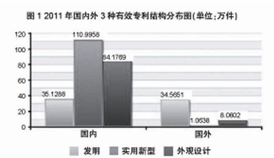 截至2011年底,我國有效專利共計273.9906萬件。其中,國內(nèi)230.3015萬件,同比增長26.2%,占總量的比重較去年提升1.7個百分點,達到84.1%;國外43.6891萬件,同比增長11.8%,占總量的15.9%。分專利類型看,有效發(fā)明專利69.6939萬件,同比增長23.4%,占總量的比重為25.4%,較去年下降0.1個百分點;有效實用新型專利112.0596萬件,同比增長30.6%,占總量的比重達到40.9%,較去年提高2.2個百分點;有效外觀設(shè)計專利92.2371萬件,同比增長16.3%,占總量的比重為33.7%,較去年下降2.1個百分點。