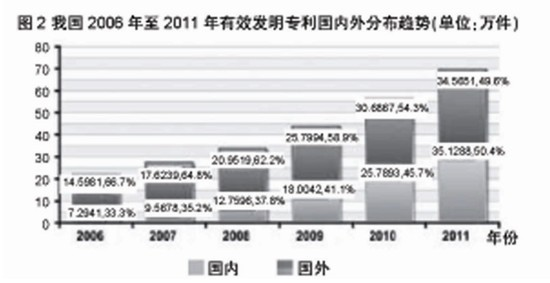 近年來,隨著我國自主創(chuàng)新能力的不斷提升,年度發(fā)明專利申請中的國內(nèi)比例已接近八成,授權(quán)的國內(nèi)比例達到65.3%。在有效發(fā)明專利方面,回顧2006年底我國有效發(fā)明專利中,國內(nèi)擁有7.2941萬件,國外擁有14.5981萬件,所占比重相差33.4%。近5年來,國內(nèi)有效發(fā)明專利以年均36.9%的速度增長,遠高于國外18.8%的增長速度,2011年國內(nèi)發(fā)明專利擁有量比例首次超過國外在華量,這是我國創(chuàng)新能力不斷提高的必然結(jié)果,也標志著我國專利事業(yè)邁入了一個新的發(fā)展階段。