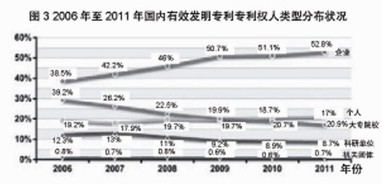 2011年,國內(nèi)有效發(fā)明專利中,企業(yè)擁有量為18.5357萬件,占52.8%;大專院校擁有量為7.3320萬件,占20.9%;個人擁有量為5.9747萬件,占17.0%;科研單位擁有量為3.0545萬件,占8.7%;機關(guān)團體擁有量為2319件,占0.7%。