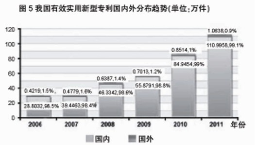 截至2011年底,我國有效實用新型專利總量為112.0596萬件,同比增長30.6%。其中,國內(nèi)有效實用新型專利110.9958萬件,占總量的99.1%,同比增長30.7%;國外有效實用新型專利1.0638萬件,占總量的0.9%,同比增長24.9%(參見圖5)。