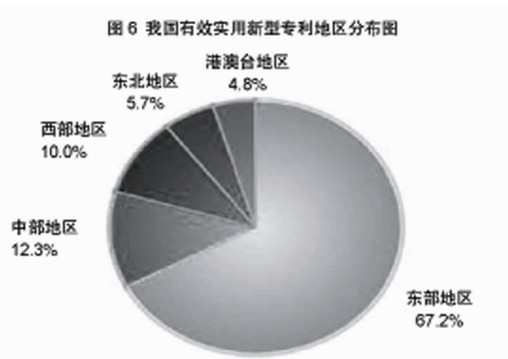 截至2011年底,我國東部地區(qū)有效發(fā)明專利量為23.1272萬件,中部地區(qū)3.3457萬件,西部地區(qū)3.3419萬件,東北地區(qū)2.0007萬件,港澳臺地區(qū)3.3133萬件,分別占65.8%、9.5%、9.5%、5.7%和9.4%。有效專利呈現(xiàn)出由東部向中西部遞減的階梯特征,差異十分明顯。有效發(fā)明專利排名前五位的地區(qū)分別是廣東(5.8648萬件),北京(5.2522萬件),上海(3.1117萬件),江蘇(2.9385萬件),浙江(2.5728萬件),排名前五位的都位于東部地區(qū),其專利擁有的數(shù)量也遠大于其他地區(qū),這與我國經(jīng)濟結(jié)構(gòu)的基本特點吻合。
