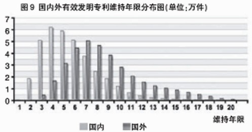 圖9顯示了當前國內(nèi)外有效發(fā)明專利維持年限的分布,其橫坐標為維持年限,縱坐標為有效量。由圖可見,國內(nèi)有效發(fā)明專利維持年限多集中在3年至6年,而國外則集中在6年至9年。在國內(nèi)有效發(fā)明專利中,維持年限5年以下的(即申請于2007年1月1日或之后)占54.3%,而國外這一比例只有15.2%;國內(nèi)有效發(fā)明專利中,有效期超過10年的(即申請于2001年12月31日或之前)只占4.8%,較2010年小幅提高0.2%,而國外這一比例達到24.7%,較2010年提高0.9%。