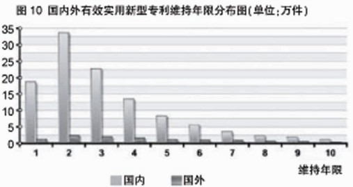 圖10顯示了當前國內(nèi)外有效實用新型專利維持年限的分布,其橫坐標為維持年限,縱坐標為有效量。由圖可見,國內(nèi)有效實用新型專利維持年限多集中在1年至4年,而國外則平均分布在2年至7年。在當前有效的110.9958萬件國內(nèi)實用新型專利中,已維持超過5年的實用新型專利僅有14.1972萬件,占國內(nèi)有效實用新型專利總量的12.8%,而國外這一比例是28.3%。