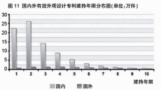 2011年,國內(nèi)有效外觀設(shè)計專利中,職務專利為42.735萬件,同比增長30.3%,占國內(nèi)有效外觀設(shè)計專利的比重為50.8%,首次超過半數(shù);非職務專利為41.4419萬件,同比增長6.2%,占國內(nèi)有效外觀設(shè)計專利的比重為49.2%。在國外有效外觀設(shè)計專利中,職務專利為7.807萬件,同比增長6.9%,占國外有效外觀設(shè)計專利的比重為96.9%;非職務專利2532件,同比增長12.4%,占國外有效外觀設(shè)計專利的比重為3.1%。