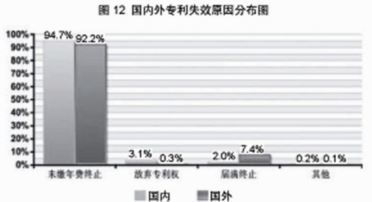 專利失效原因主要分為4種:未繳年費終止、放棄專利權(quán)、屆滿終止和其他。2011年我國國內(nèi)失效專利中,未繳年費終止的占94.7%,放棄專利權(quán)的3.1%,屆滿終止的占2.0%,其他占0.2%。