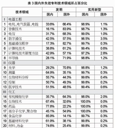按世界知識產(chǎn)權(quán)組織(WIPO)最新修訂的技術(shù)領(lǐng)域分類標準(2011年8月更新),在35個技術(shù)領(lǐng)域中,國內(nèi)在食品化學、藥品、材料冶金等18個領(lǐng)域占據(jù)優(yōu)勢。但在如光學、半導體、計算機技術(shù)等高新技術(shù)領(lǐng)域,國外所占比例仍超過國內(nèi)。