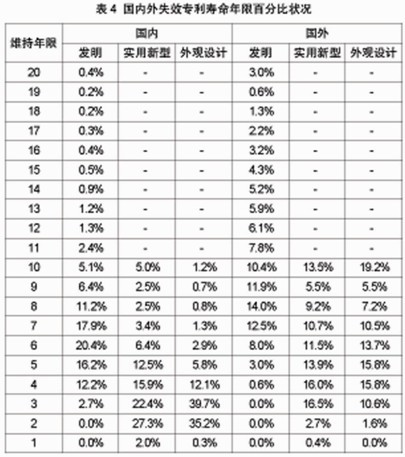 失效專利的壽命就是失效專利從申請日開始計算到其失效的時間。失效專利的最長壽命年限即其最長保護期限,發(fā)明專利最長保護期限為20年,實用新型與外觀設(shè)計專利的最長保護期限均為10年。從表4可以看出,達到最長壽命年限的國外發(fā)明、實用新型和外觀設(shè)計專利量分別占其總量的3.0%、13.5%和19.2%,而國內(nèi)僅占0.4%、5.0%和1.2%,差距明顯。