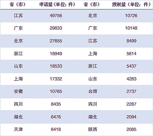 在各省市區(qū)發(fā)明專利申請受理量排名中,江蘇以4.9756萬件的申請量繼續(xù)保持領(lǐng)先,廣東和北京以2.9833萬件和2.7655萬件緊隨其后,浙江和山東則以1.8949萬件和1.8533萬件進(jìn)入前五;在專利授權(quán)量排名中,北京以1.0726萬件位居第一,廣東、江蘇、上海、浙江則分別以1.0148萬件、8499件、5614件、5437件進(jìn)入前五。值得關(guān)注的是,與去年同期排名相比,北京取代廣東位居專利授權(quán)量榜首,天津取代遼寧進(jìn)入專利申請受理量前十,而安徽則取代遼寧進(jìn)入專利授權(quán)量排名前十。
