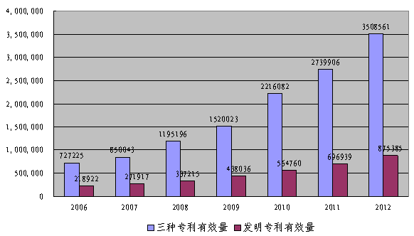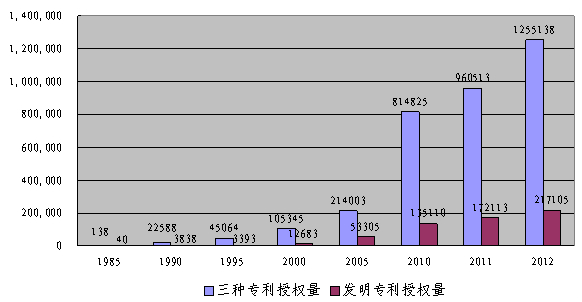 專利申請受理量和專利授權(quán)量快速增長。專利制度實(shí)施之初的1986年,我國三種專利申請受理量僅為1.8萬件,專利授權(quán)量僅為3,024件。2012年,三種專利申請受理量205.1萬件,專利授權(quán)量125.5萬件,比1986年分別增長109.8倍和414.1倍。2012年,發(fā)明專利申請受理量65.3萬件、專利授權(quán)量21.7萬件,比1986年分別增長80.5倍和3875.9倍。2011年以來,我國發(fā)明專利申請受理量居世界第一。2012年7月,我國發(fā)明專利累計(jì)授權(quán)量突破100萬件。用時(shí)27年,成為世界上實(shí)現(xiàn)這一目標(biāo)最快的國家。