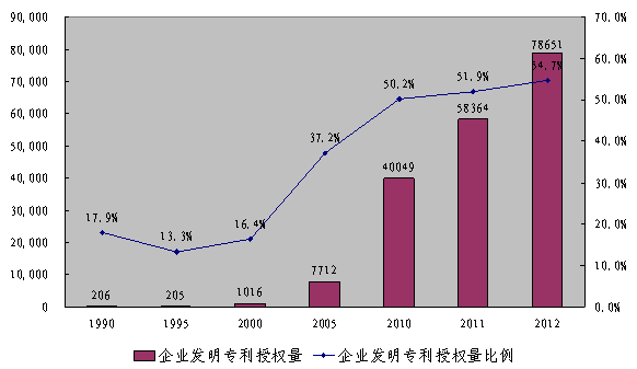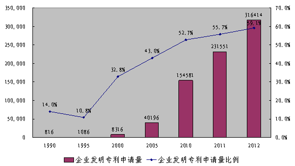 國內(nèi)企業(yè)創(chuàng)新能力顯著增強(qiáng)。專利制度有力地推動(dòng)我國企業(yè)創(chuàng)新活動(dòng)和專利工作,越來越多的企業(yè)視專利技術(shù)為企業(yè)核心競爭力,將專利管理工作納入企業(yè)研發(fā)、生產(chǎn)與經(jīng)營的全過程,企業(yè)專利數(shù)量不斷增加,專利質(zhì)量穩(wěn)步提升。1987年,國內(nèi)企業(yè)發(fā)明專利申請量僅564件,占國內(nèi)發(fā)明專利申請量的14.2%;專利授權(quán)量僅33件,占國內(nèi)發(fā)明專利授權(quán)量的10.6%。2012年,國內(nèi)企業(yè)發(fā)明專利申請量為31.6萬件,占比59.1%;專利授權(quán)量7.86萬件,占比54.7%。2012年,華為、中興、中石油等知識(shí)產(chǎn)權(quán)優(yōu)勢企業(yè)的國內(nèi)發(fā)明專利申請量分別為4231件、3446件和3334件,遠(yuǎn)遠(yuǎn)超過松下(2191件)、索尼(2184件)、三星(1754件)等跨國公司的在華發(fā)明專利申請量。