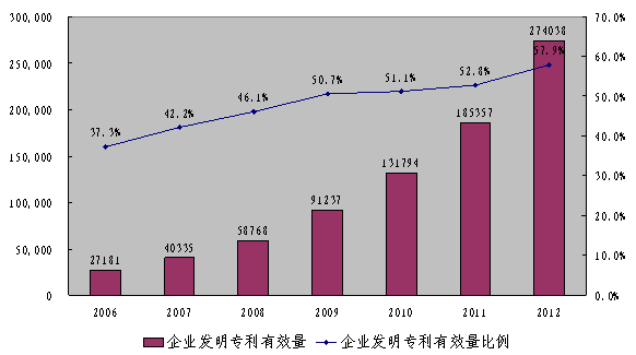 國內(nèi)有效發(fā)明專利數(shù)量超過國外在華量。2011年,國內(nèi)發(fā)明專利擁有量首次超過國外在華發(fā)明專利擁有量。截至2012年底,經(jīng)國家知識(shí)產(chǎn)權(quán)局授權(quán)并維持有效的三種專利共350.9萬件,其中有效發(fā)明專利87.5萬件。國內(nèi)申請人擁有有效發(fā)明專利為47.3萬件,占有效發(fā)明專利總量的54.1%,比2006年增長5.5倍,所占比重提高20.8個(gè)百分點(diǎn)。截至2012年底,我國每萬人口發(fā)明專利擁有量(不含港澳臺(tái))達(dá)到3.23件。國內(nèi)企業(yè)擁有有效發(fā)明專利為27.3萬件,占國內(nèi)有效發(fā)明專利量的57.9%,比2006年增長9.1倍,所占比重提高20.6個(gè)百分點(diǎn)。
