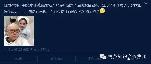 1月9日上午,《非誠勿擾》主持人孟非在醫(yī)院病房發(fā)微博調(diào)侃:“既然深圳市中院說‘非誠勿擾’這個(gè)名字歸溫州人金阿歡金老板,江蘇臺(tái)不許用了,那我正好住院去了……病房有電視,看看今晚《非誠勿擾》播不播?”