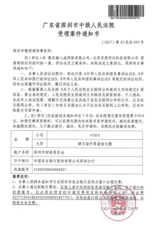 精英商標(biāo)所將豬八戒公司和百度起訴至深圳中院,即日受理立案