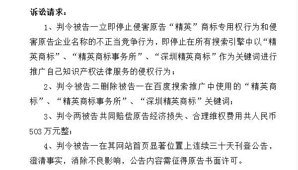 我國商標(biāo)法律有關(guān)規(guī)定,商標(biāo)的使用是指將商標(biāo)用于商品、商品包裝或者容器以及商品交易文書上,或者將商標(biāo)用于廣告宣傳、展覽以及其他商業(yè)活動中,用于識別商品或服務(wù)來源的行為。精英商標(biāo)所認(rèn)為,首先,豬八戒公司在三大搜索引擎所提供的廣告中,將“精英”商標(biāo)設(shè)置為關(guān)鍵詞,搜索的置前、置頂結(jié)果卻為八戒知識產(chǎn)權(quán)網(wǎng)站,并購買競價排名服務(wù),使搜索結(jié)果置前,客觀上會使搜索用戶認(rèn)為精英與豬八戒公司存在某種特定關(guān)系,產(chǎn)生了混淆、誤認(rèn)、侵害了精英的注冊商標(biāo)專用權(quán);第二,豬八戒公司亦提供商標(biāo)、版權(quán)、專利代理等知識產(chǎn)權(quán)服務(wù),與精英商標(biāo)所所提供的服務(wù)基本相同, 是精英的同行競爭者,在明知精英字號在行業(yè)內(nèi)具有較高知名度的情況下,仍將精英字號作為關(guān)鍵詞推廣其自己的知識產(chǎn)權(quán)服務(wù),具有明顯的不正當(dāng)性,豬八戒公司的行為造成相關(guān)公眾誤解其提供的服務(wù)與精英存在關(guān)聯(lián),或?qū)е洛e誤選擇知識產(chǎn)權(quán)服務(wù)商,損害了精英商號權(quán),構(gòu)成了不正當(dāng)競爭;第三,豬八戒公司作為精英商標(biāo)所的同行,又是互聯(lián)網(wǎng)服務(wù)專業(yè)提供商,其行為的根本目的是利用自身互聯(lián)網(wǎng)的技術(shù)優(yōu)勢,借精英商標(biāo)所的商譽和知名度進(jìn)行商標(biāo)業(yè)務(wù)的推廣,不正當(dāng)搶奪精英商標(biāo)所的客戶和潛在客戶,搶占精英商標(biāo)所市場份額,其惡意非常明顯,其行為極其惡劣,理應(yīng)依法給予嚴(yán)懲及懲罰性賠償;第四,百度公司在提供有償?shù)母們r排名服務(wù)時,未盡到相應(yīng)的審查義務(wù),且接到精英的通知后并未斷開侵權(quán)鏈接,依法應(yīng)承擔(dān)相應(yīng)的侵權(quán)責(zé)任。為了保護(hù)自身的知識產(chǎn)權(quán)合法權(quán)益,通過司法途徑確認(rèn)互聯(lián)網(wǎng)付費推廣應(yīng)當(dāng)遵循法律規(guī)則,規(guī)范知識產(chǎn)權(quán)同行在互聯(lián)網(wǎng)中的經(jīng)營及競爭行為,精英商標(biāo)所打響行業(yè)保衛(wèi)戰(zhàn)第一槍。2017年4月20日,精英商標(biāo)所以侵害商標(biāo)專用權(quán)及企業(yè)商號權(quán)為由將豬八戒公司和百度起訴至法院,提出了侵權(quán)者賠償人民幣503萬元等訴訟請求,深圳市中級人民法院即日受理立案,案號為(2017)粵03民初890號。
