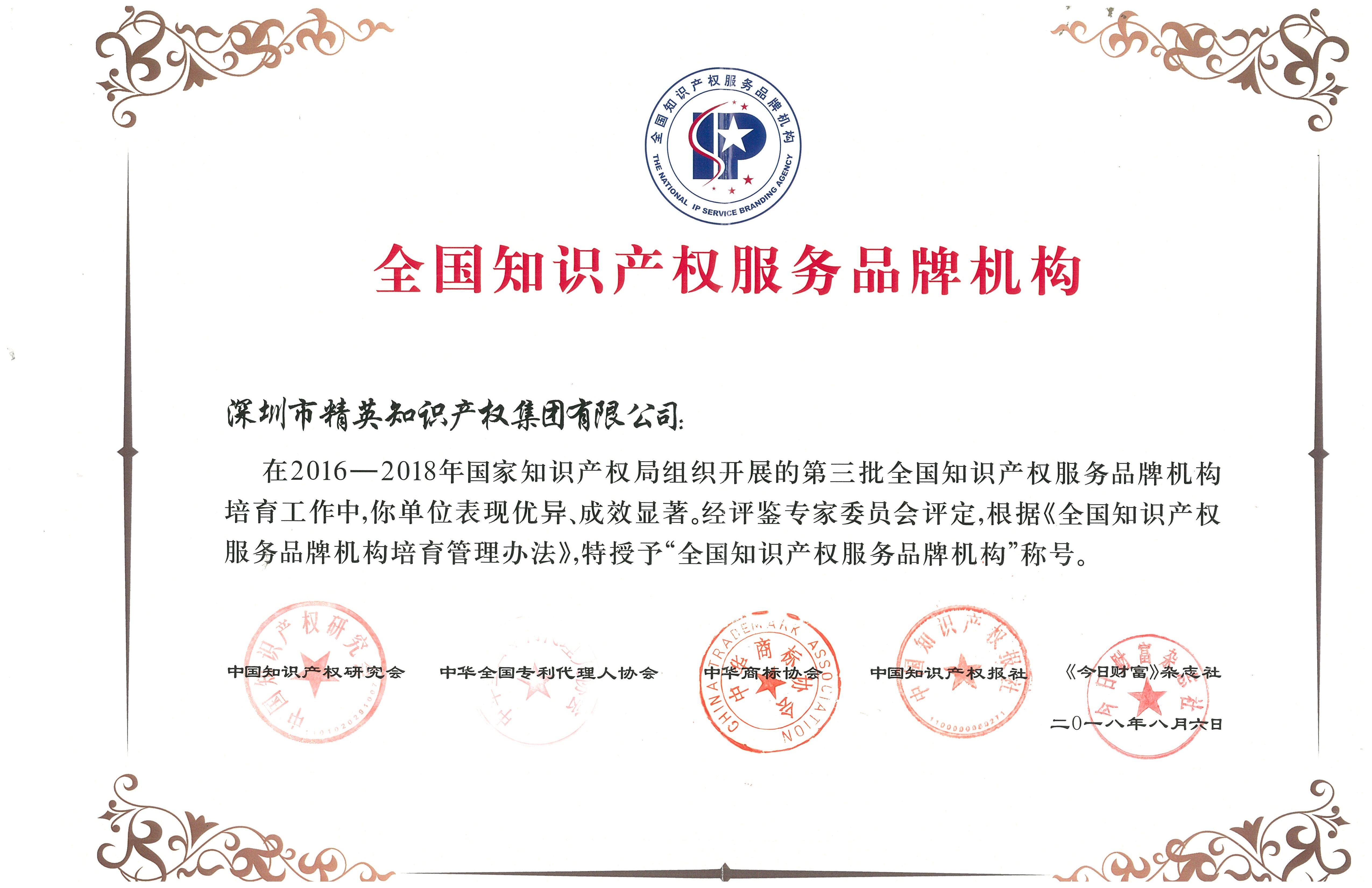 2018年8月6日,第三批全國知識產(chǎn)權(quán)服務(wù)品牌機構(gòu)評鑒發(fā)布會暨知識產(chǎn)權(quán)服務(wù)業(yè)高級管理人員研修班開班式在京舉行,國家知識產(chǎn)權(quán)局副局長甘紹寧出席并致辭。在評鑒結(jié)果發(fā)布環(huán)節(jié),中國知識產(chǎn)權(quán)研究會、中華全國專利代理人協(xié)會、中華商標(biāo)協(xié)會、中國知識產(chǎn)權(quán)報社、中國知識產(chǎn)權(quán)培訓(xùn)中心、《今日財富》雜志社等5家單位聯(lián)合發(fā)布了第三批43家“全國知識產(chǎn)權(quán)服務(wù)品牌機構(gòu)”名單,并頒發(fā)了證書。