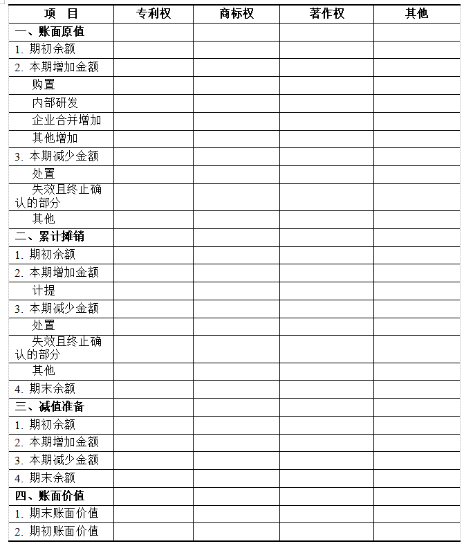 (一)企業(yè)應(yīng)當按照類別對確認為無形資產(chǎn)的知識產(chǎn)權(quán)(以下簡稱無形資產(chǎn))相關(guān)會計信息進行披露,具體披露格式如下: