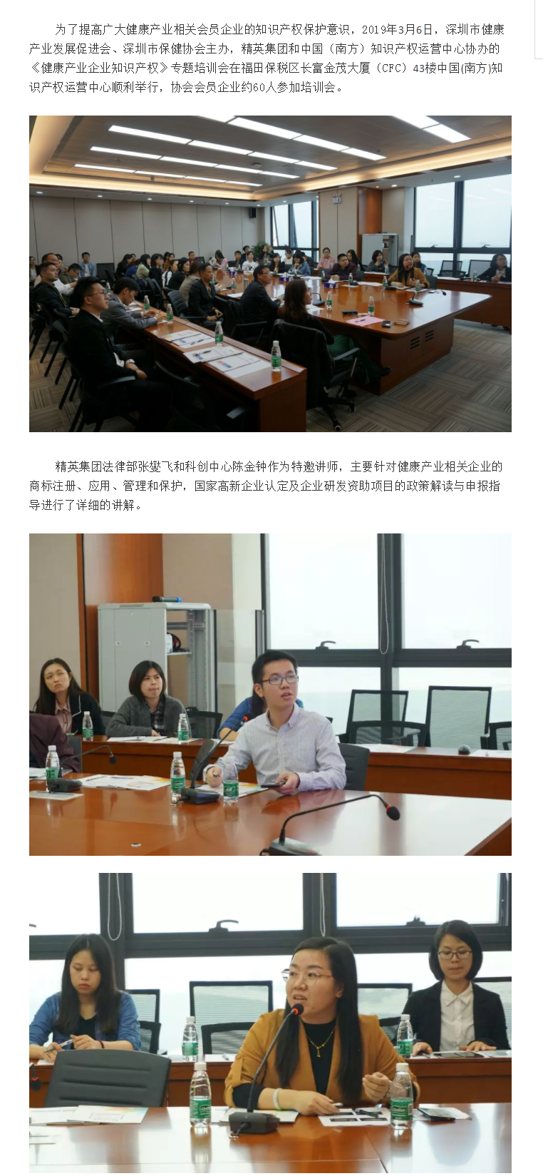 深圳市健康產(chǎn)業(yè)發(fā)展促進(jìn)會(huì)、深圳市保健協(xié)會(huì)主辦,精英集團(tuán)協(xié)辦的《健康產(chǎn)業(yè)企業(yè)知識(shí)產(chǎn)權(quán)》專題培訓(xùn)會(huì)順利舉行