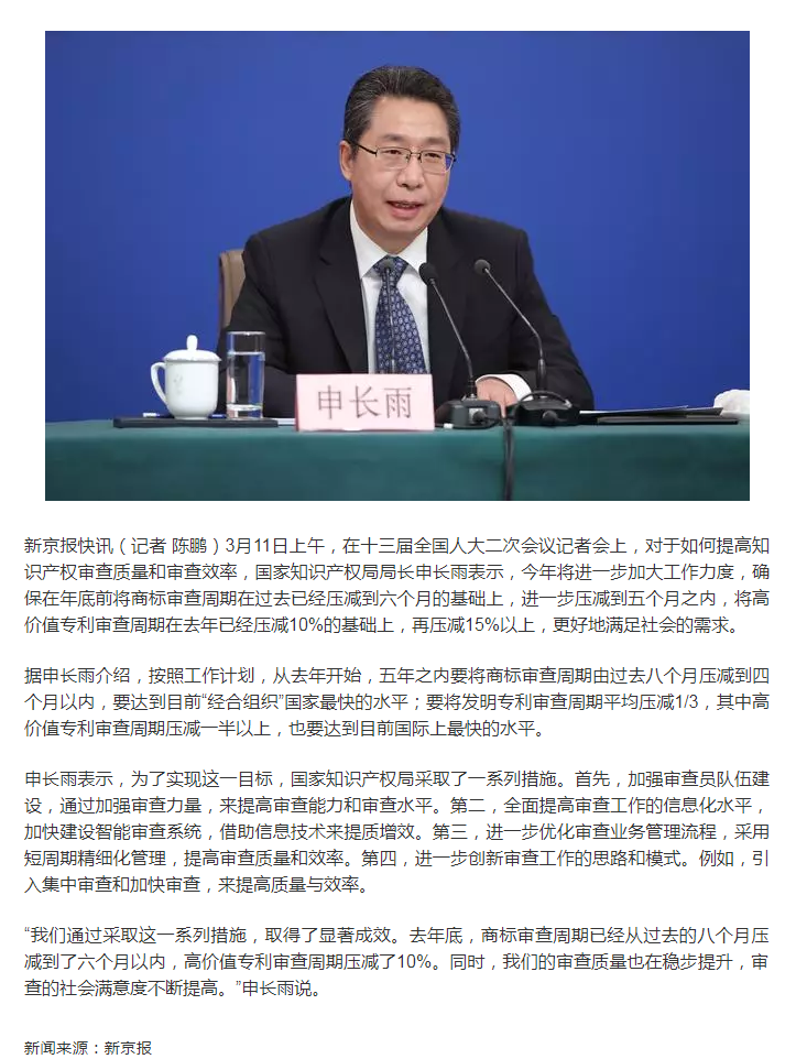 申長雨:年底前將商標(biāo)審查周期進(jìn)一步壓減到五個月之內(nèi)