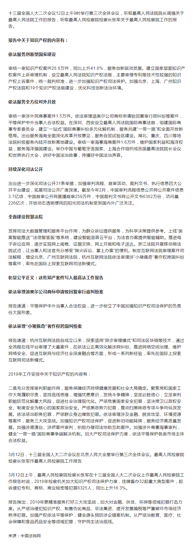 最高法院2019年兩會(huì)工作報(bào)告中的“知識(shí)產(chǎn)權(quán)內(nèi)容