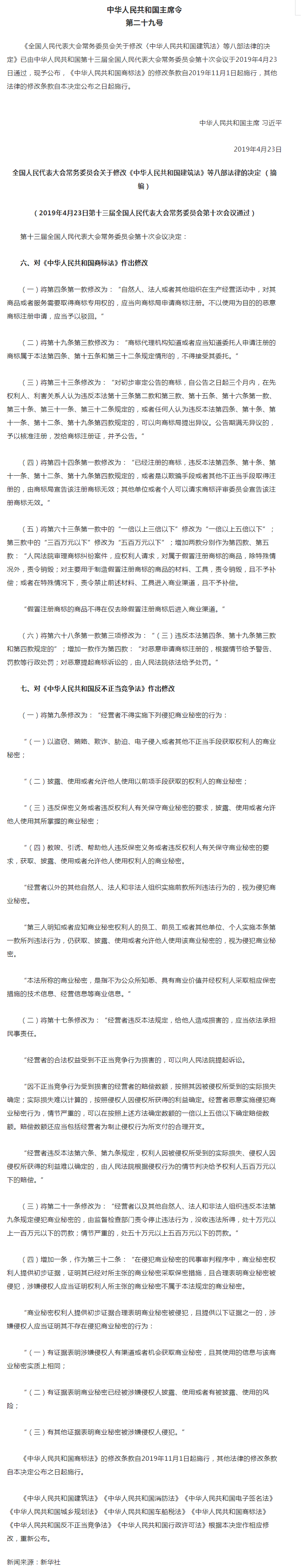 全國(guó)人大常務(wù)委員決定對(duì)《商標(biāo)法》《反不正當(dāng)競(jìng)爭(zhēng)法》等八部法律作出修改