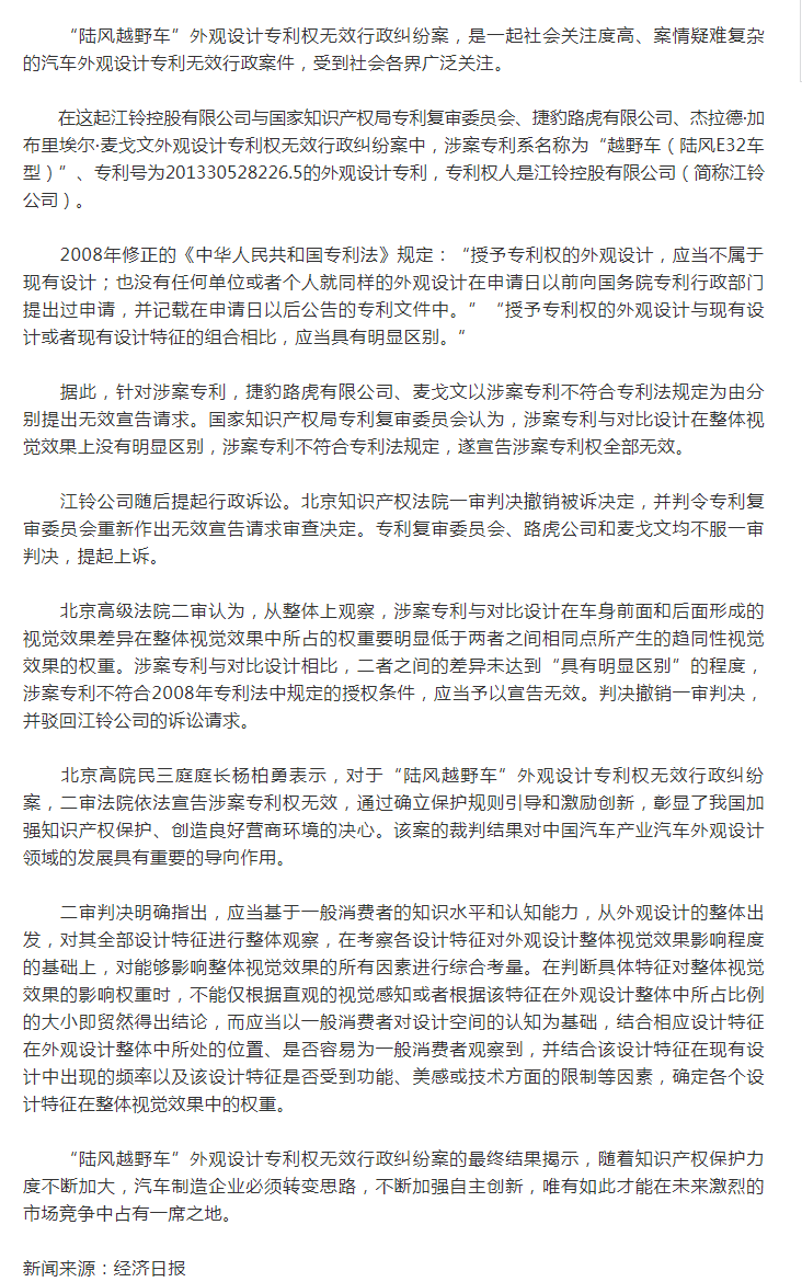 “陸風(fēng)越野車”外觀設(shè)計(jì)專利權(quán)無效行政糾紛案:公正裁判引導(dǎo)激勵(lì)創(chuàng)新