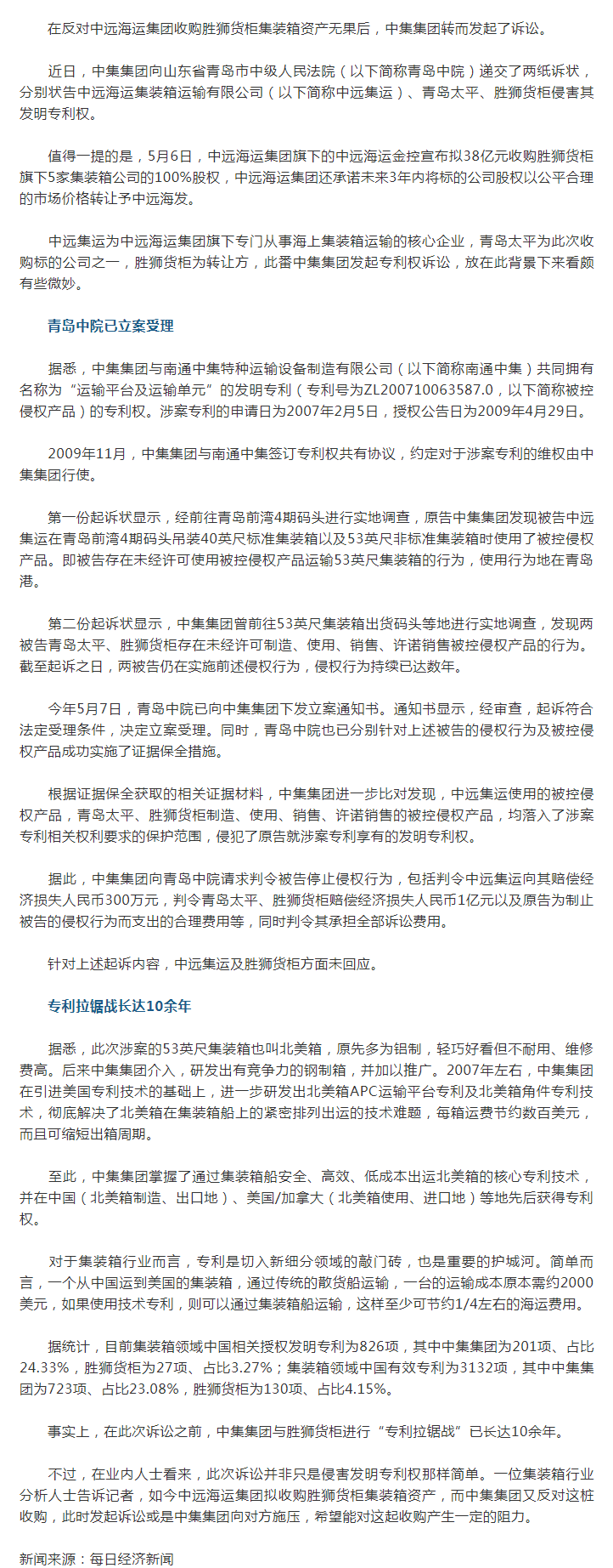 中集集團稱被侵害發(fā)明專利權(quán) 狀告中遠集運等索賠超1億