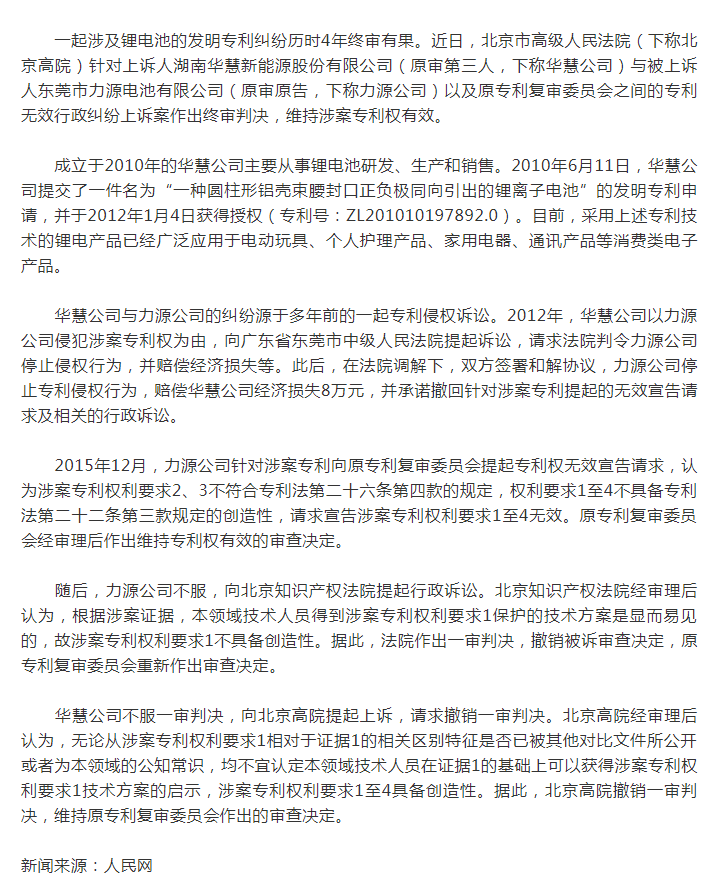 歷時(shí)4年,鋰電池專(zhuān)利權(quán)終被維持有效