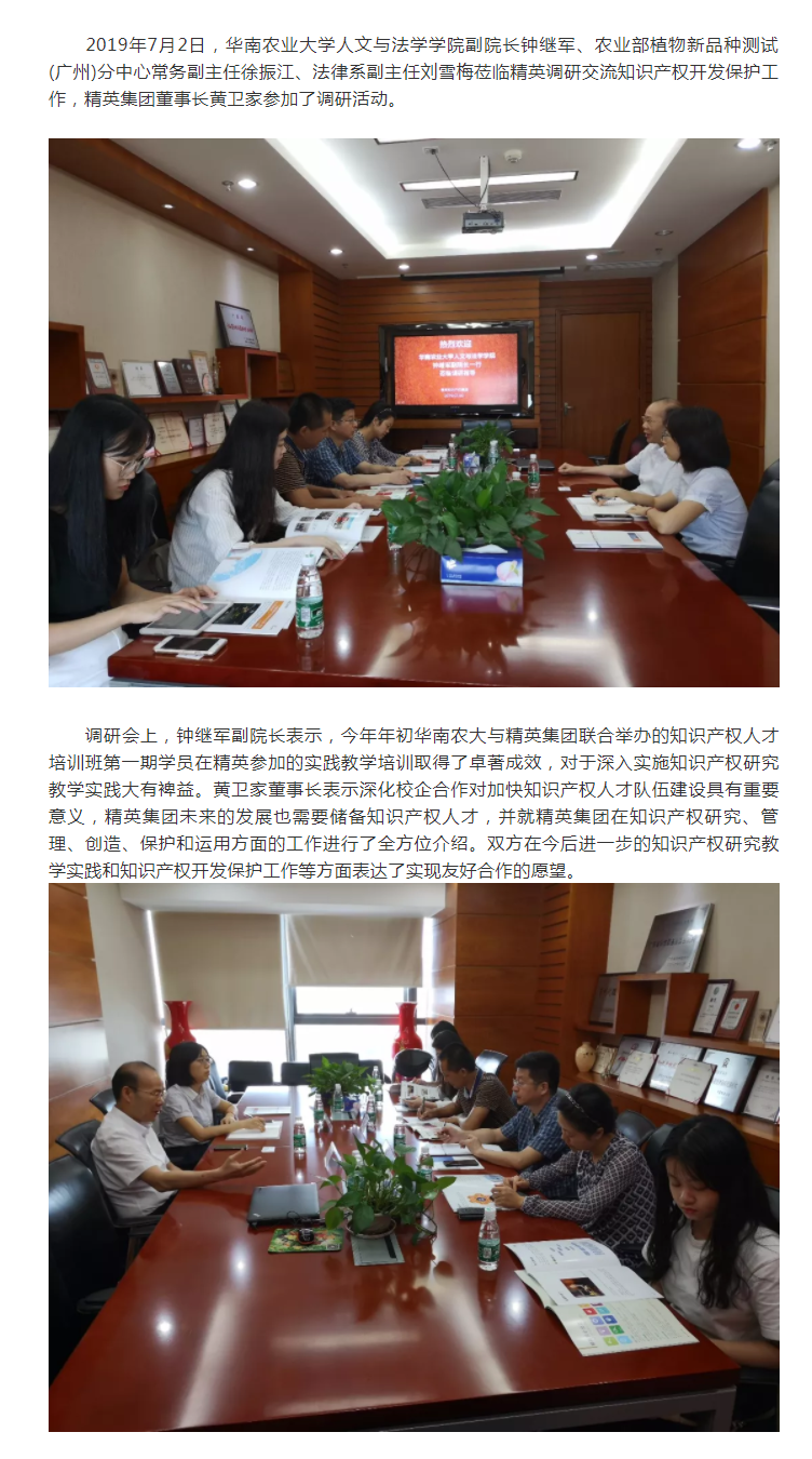 華南農(nóng)業(yè)大學(xué)人文與法學(xué)學(xué)院鐘繼軍副院長一行蒞臨精英調(diào)研交流知識產(chǎn)權(quán)開發(fā)保護(hù)工作