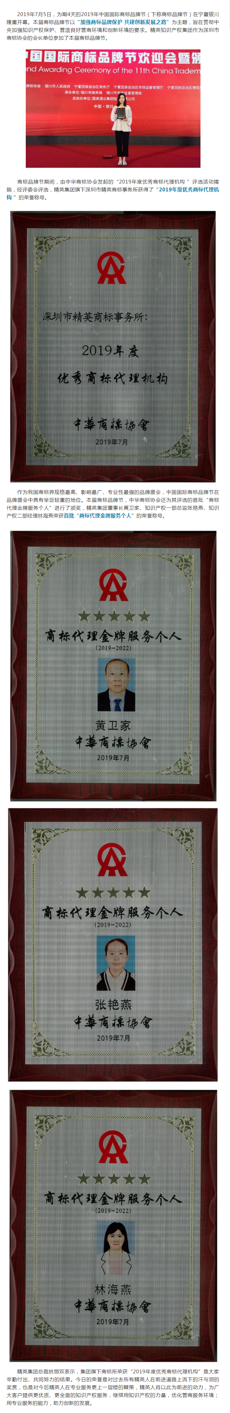 2019中國(guó)國(guó)際商標(biāo)品牌節(jié),精英集團(tuán)商標(biāo)事務(wù)所榮獲“2019年度優(yōu)秀商標(biāo)代理機(jī)構(gòu)”