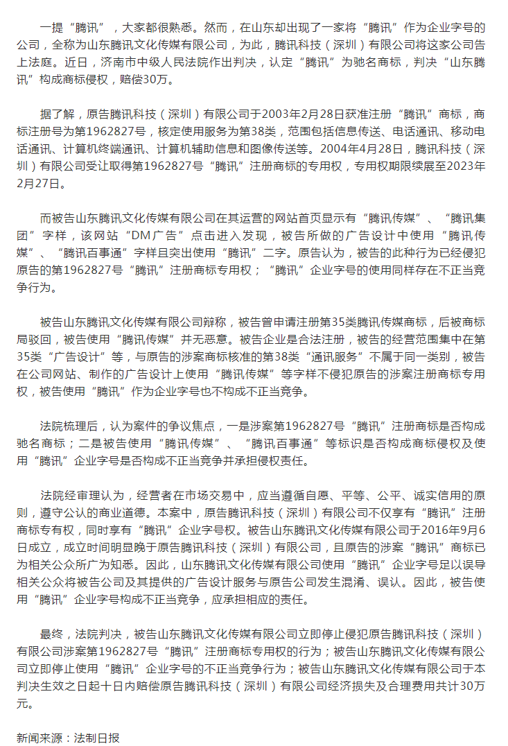 山東省濟南中院判決“山東騰訊”構成商標侵權賠償30萬