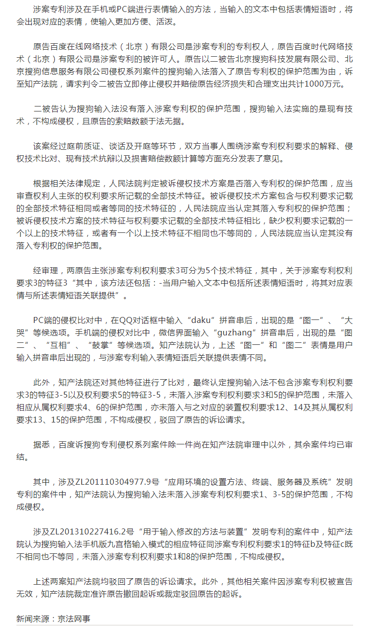 北京知識(shí)產(chǎn)權(quán)法院一審審結(jié)百度訴搜狗專利侵權(quán)系列案件