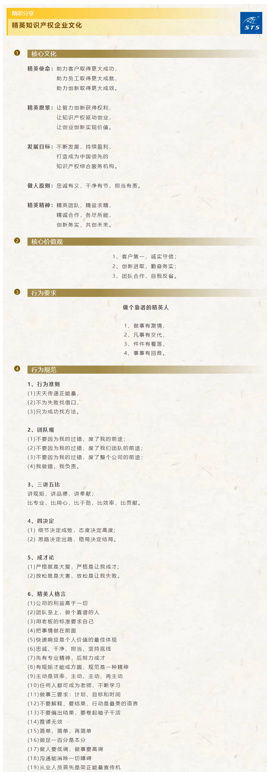 為加強(qiáng)精英知識產(chǎn)權(quán)集團(tuán)企業(yè)文化建設(shè),營造積極向上的氛圍,激勵(lì)新員工快融入、有擔(dān)當(dāng)、努力追求進(jìn)步,2020年4月9日,精英集團(tuán)召集新入職員工學(xué)習(xí)精英知識產(chǎn)權(quán)企業(yè)文化,黃衛(wèi)家董事長親自圍繞核心文化、核心價(jià)值觀、行為要求、行為規(guī)范、用人標(biāo)準(zhǔn)、素質(zhì)考核等內(nèi)容進(jìn)行分享,鼓勵(lì)新員工邁出精英第一步,開啟精英夢想之路。