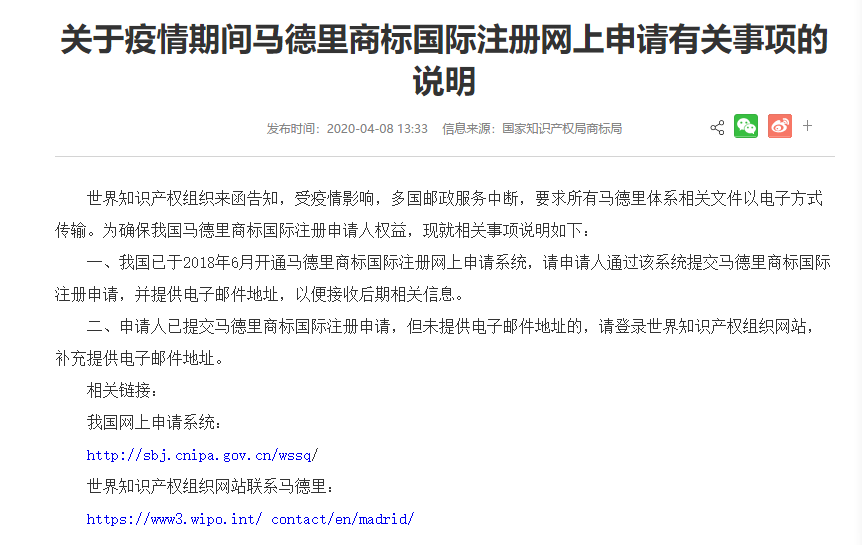 為保障馬德里體系在各國針對疫情采取的措施下保持順暢運(yùn)轉(zhuǎn),確保馬德里用戶、各成員國知識產(chǎn)權(quán)局和產(chǎn)權(quán)組織國際局等在馬德里體系流程中可能受到的影響降到最低,世界知識產(chǎn)權(quán)組織做出了一些特別安排。關(guān)于此安排,國家知識產(chǎn)權(quán)局于4月8日發(fā)布了《關(guān)于疫情期間馬德里商標(biāo)國際注冊網(wǎng)上申請有關(guān)事項(xiàng)的說明》。