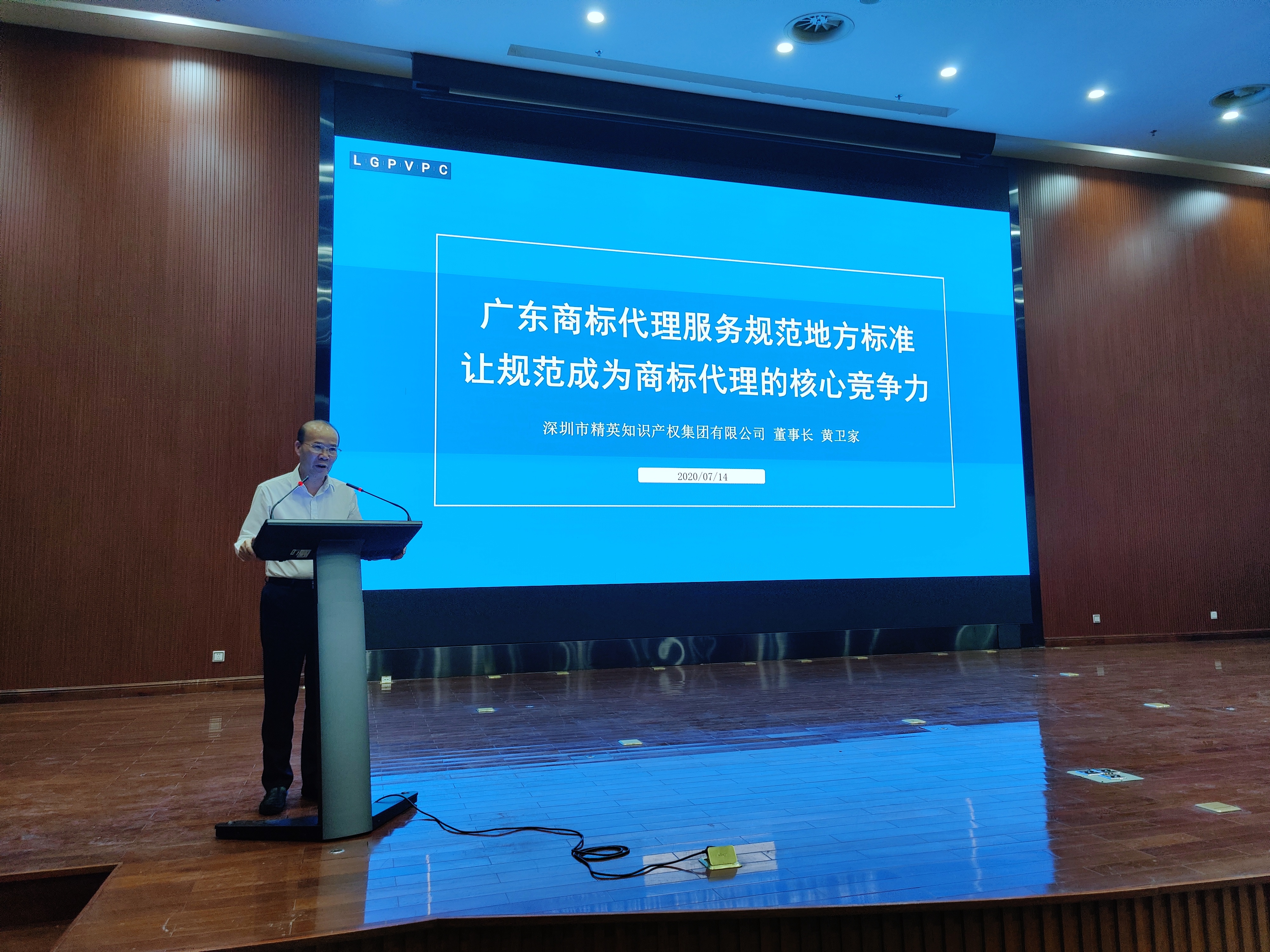 2020年7月14日下午,由廣東商標(biāo)協(xié)會主辦,廣東省市場監(jiān)督管理局(知識產(chǎn)權(quán)局)指導(dǎo),廣東省知識產(chǎn)權(quán)保護(hù)中心、廣州開發(fā)區(qū)知識產(chǎn)權(quán)局支持,廣州立白企業(yè)集團(tuán)有限公司、深圳市精英知識產(chǎn)權(quán)集團(tuán)有限公司、IPRdaily等聯(lián)合協(xié)辦的廣東商標(biāo)代理服務(wù)規(guī)范研討會在廣州市黃埔區(qū)舉辦,并同步舉行線上直播會議。精英集團(tuán)黃衛(wèi)家董事長應(yīng)邀參加研討會并在會上發(fā)言,與參會的知識產(chǎn)權(quán)公司、律所及相關(guān)企業(yè)共同探討商標(biāo)代理服務(wù)規(guī)范。