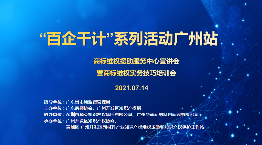 2021年7月14日下午,由廣東商標(biāo)協(xié)會(huì)、廣州開發(fā)區(qū)知識(shí)產(chǎn)權(quán)局聯(lián)合主辦,深圳市精英知識(shí)產(chǎn)權(quán)集團(tuán)有限公司、廣州華南新材料創(chuàng)新園有限公司協(xié)辦的“百企千計(jì)”商標(biāo)維權(quán)援助服務(wù)系列活動(dòng)廣州站(首站)——商標(biāo)維權(quán)援助服務(wù)中心宣講會(huì)暨商標(biāo)維權(quán)實(shí)務(wù)技巧培訓(xùn)會(huì)在廣州市黃埔區(qū)隆重舉辦。本次活動(dòng)還特邀精英知識(shí)產(chǎn)權(quán)集團(tuán)首席法律顧問伍立賢為參會(huì)人員進(jìn)行主題分享。
