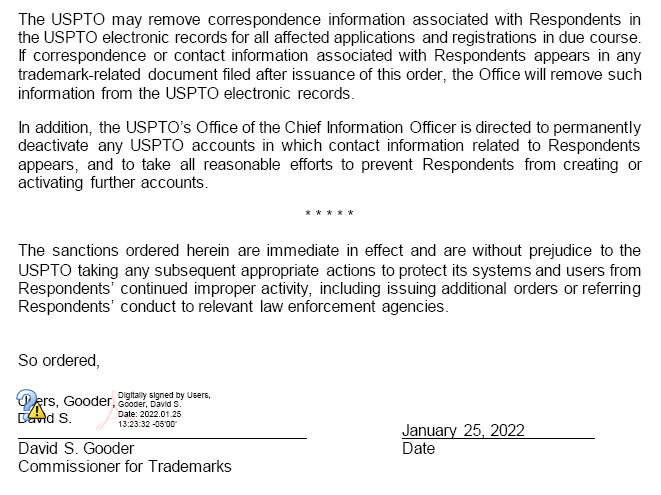 2021年11月3日,美國專利商標局再次下發(fā)行政令,撤銷涉案的三家代理公司提交的5500件注冊商標。這些商標涉嫌提供虛假信息及相關(guān)使用證據(jù)